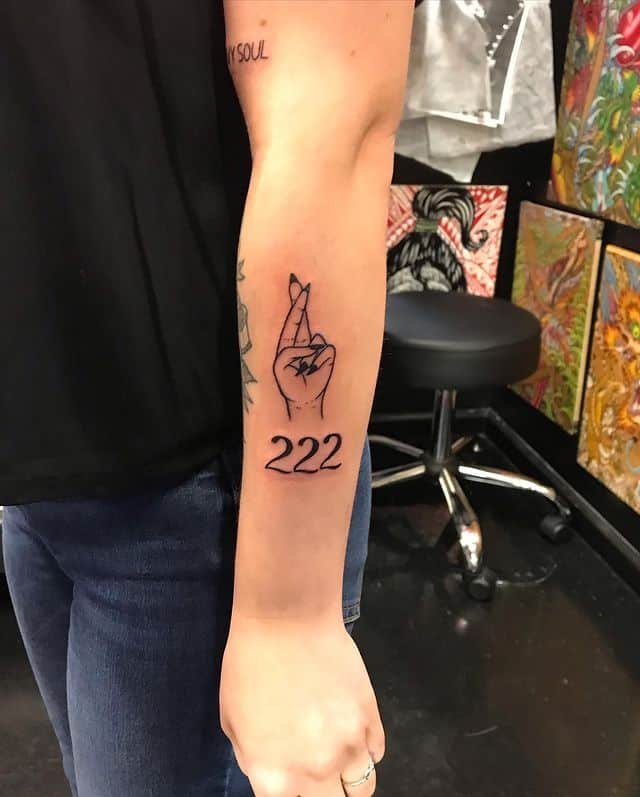 Pairing 222 under a crossed-fingers tattoo gives it a hopeful energy. The crossed fingers say “please” and “maybe,” while 222 underneath adds that spiritual nudge — trust, timing, and a little faith that things are aligning in your favor.