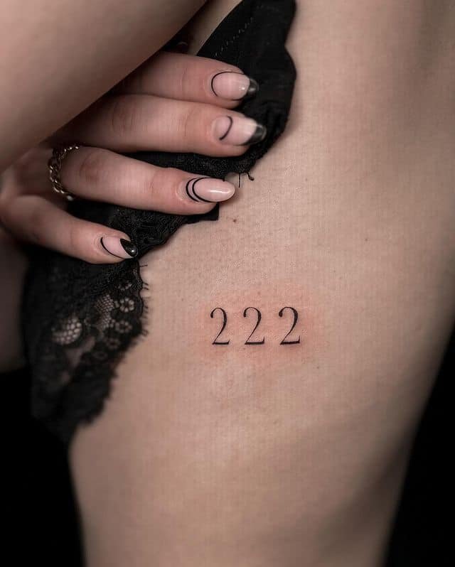 Ribs are personal and vulnerable places, so a thin 222 there feels like a soft promise to yourself. It speaks of inner alignment and quiet strength — a tender marker that the universe’s rhythm is always part of your story.