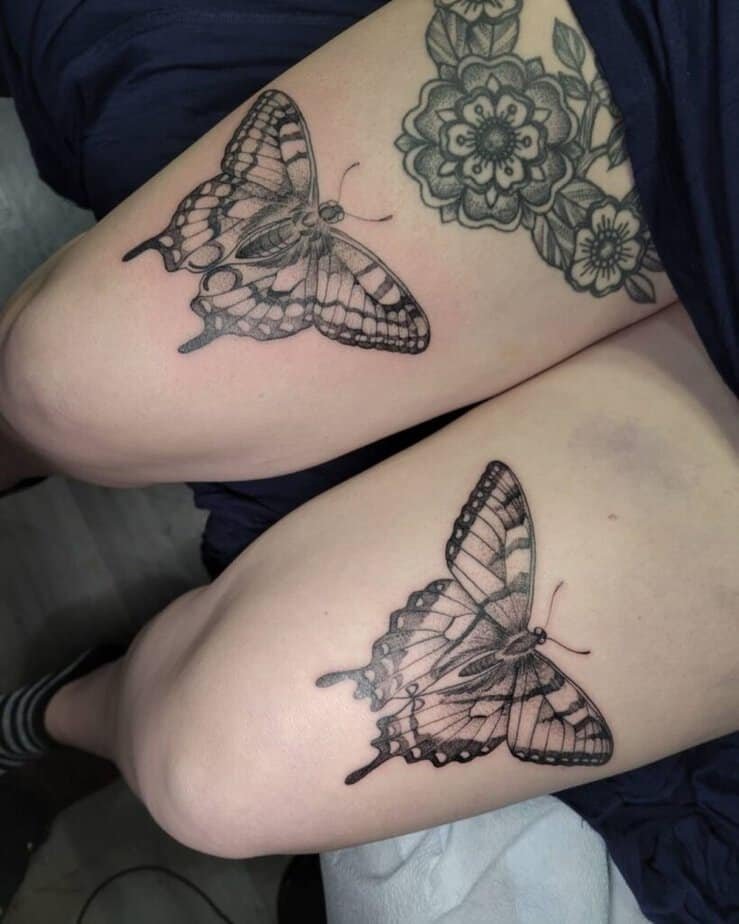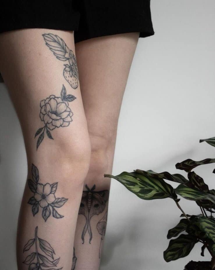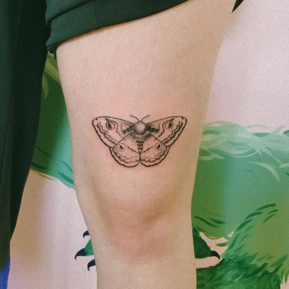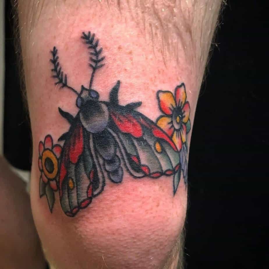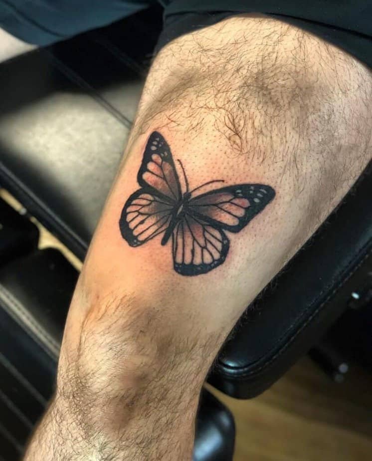 Butterflies and moths are classic for a reason — they’re about change, rebirth, and the little messy beauty of transformation. You can go big and detailed, with skulls, flames, moons, and tons of ornamentation, or keep it sweet and small with a tiny, perfectly shaded butterfly. Traditional styles with bold color and thick lines read differently than soft, detailed realism, so pick a vibe that matches the rest of your ink. Either way, these designs can curve around the knee and look effortless.