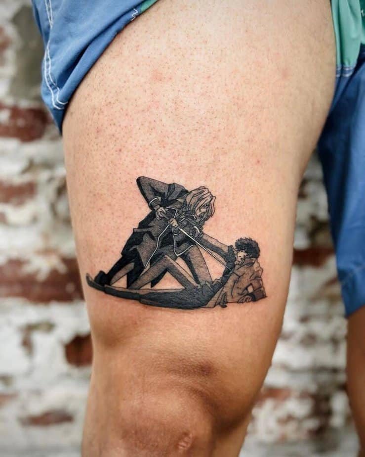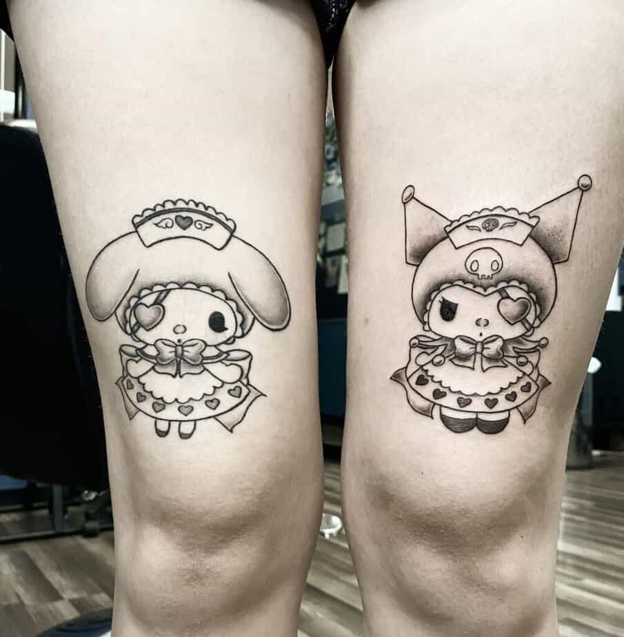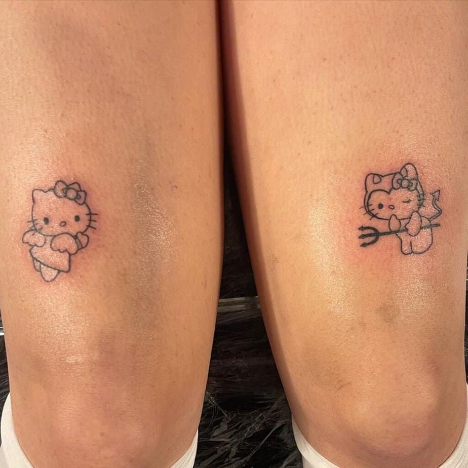 If you grew up watching anime or collecting cute characters, this is a playful spot to show that love. Think Cowboy Bebop silhouettes that complement the knee’s shape, or twins like My Melody and Kuromi for a girly-but-edgy pairing. Tiny character tattoos, like a Hello Kitty angel/devil set, read sweet and intentional without taking over your whole leg. The linework and small details are what make these sing.