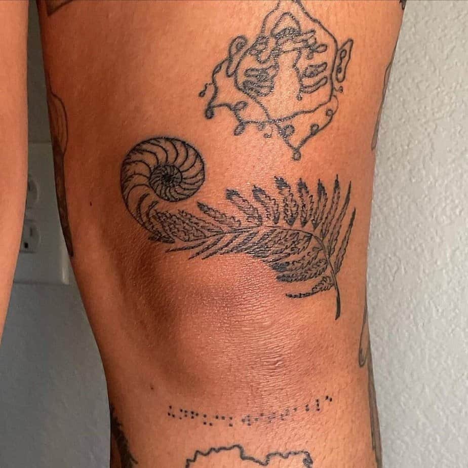 I love florals here because they read as delicate but still make a statement — especially when the composition follows the curve of the knee. You could do two branches with cherry blossoms that move with your leg, or keep it minimal with a single bloom and a couple of leaves peeking from behind. Or, if you want something a little more botanical, leaves that wrap the top of the knee and flow into a shell can look unexpectedly gorgeous and feminine. The magic is in how the design moves with your body, not against it.