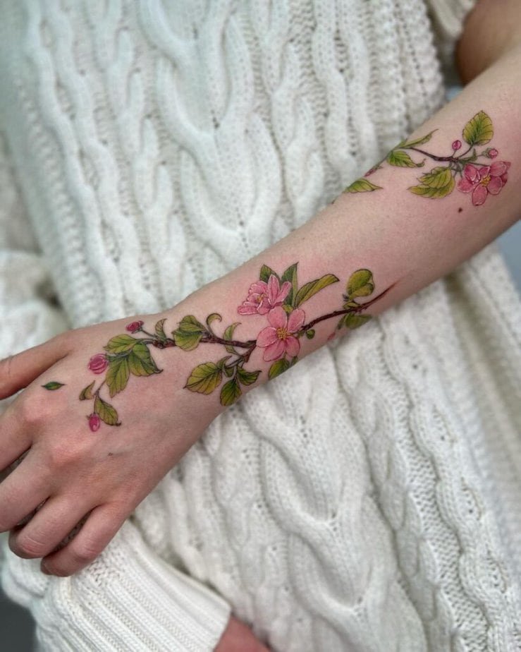 A sweeping apple blossom sleeve across the arm