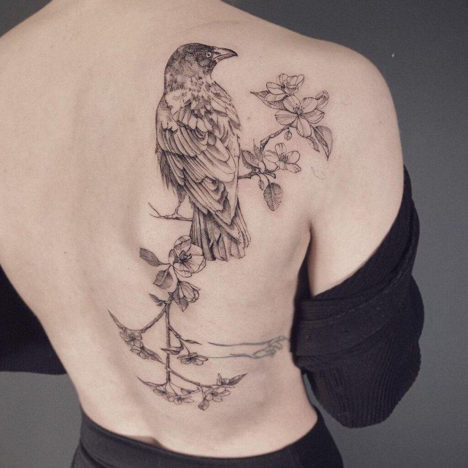 A back piece with a crow perched in the branches — moody and mysterious