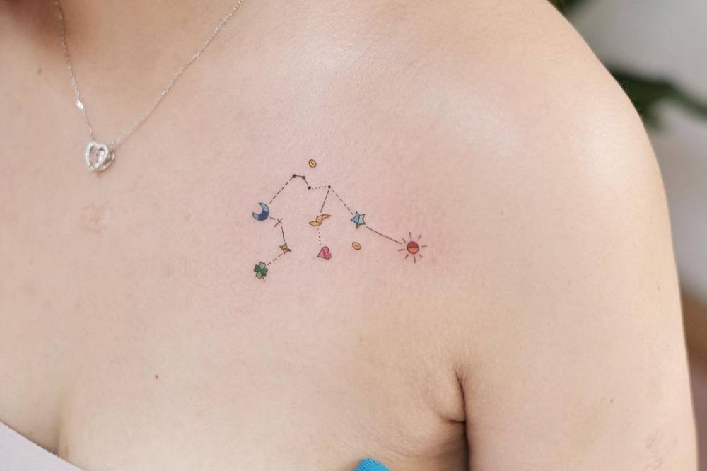This playful take adds little stars, moons, hearts, and suns to the constellation — all in color. It’s joyful, eccentric, and loud in the best possible way. If you love standing out and wearing your personality on your skin, this one’s a mood.