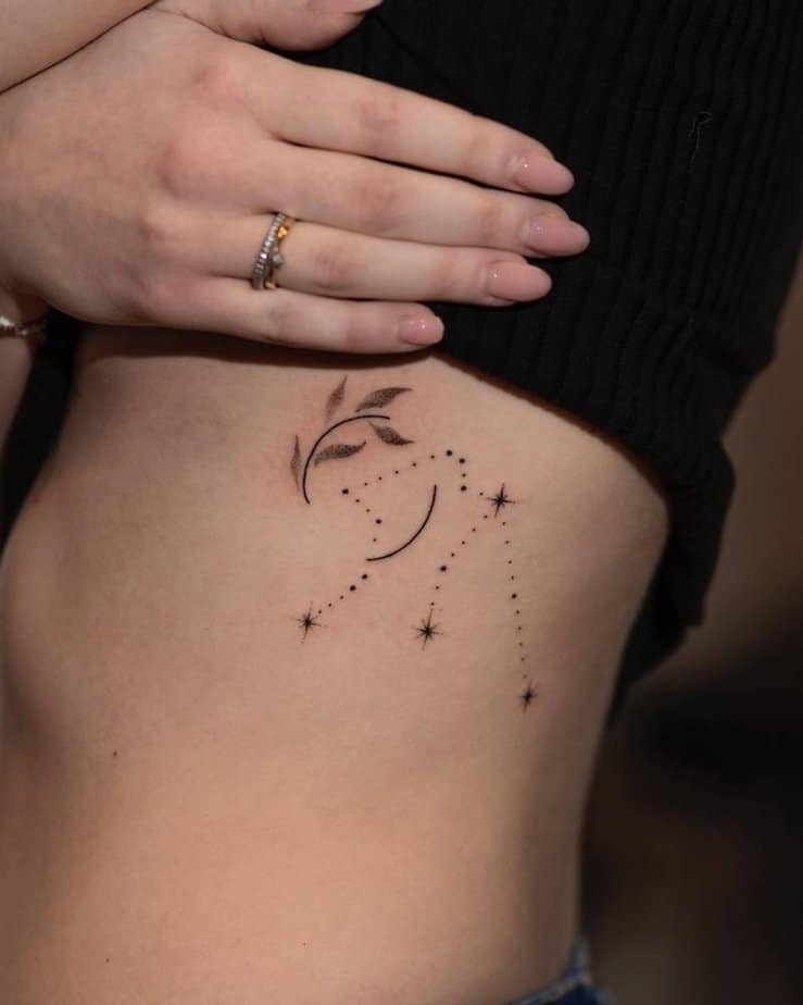This one adds soft botanical touches to the classic constellation, giving the whole piece a floaty, whimsical vibe. It sits beautifully on the ribcage and feels like a quiet promise to yourself — grounded, growing, and still wildly connected to the sky.