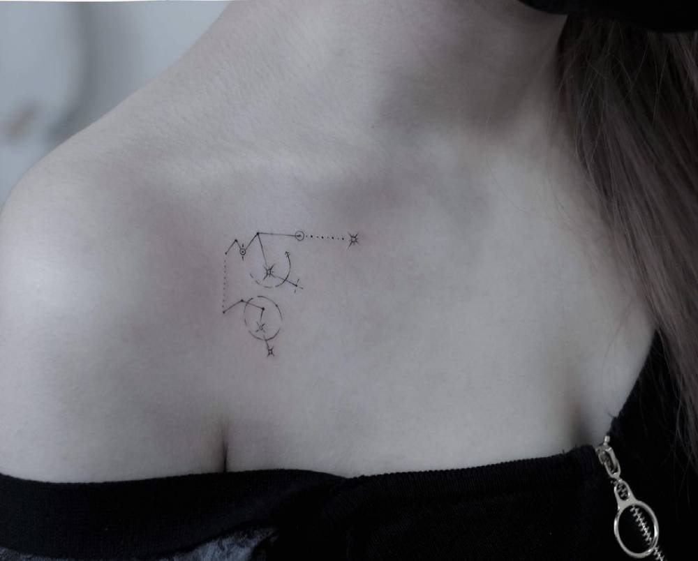 This one looks almost scientific — think atoms, energy fields, or ripples you can’t see but feel. Placed just under the collarbone, it’s for Aquarians fascinated by the invisible threads that connect everything. Smart-looking and quietly intense.