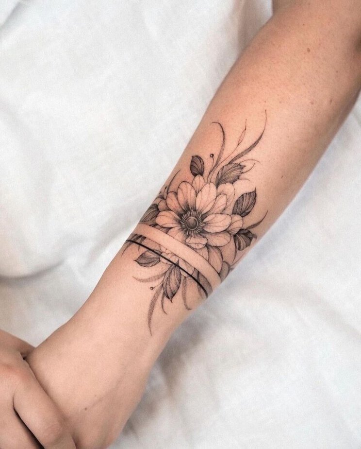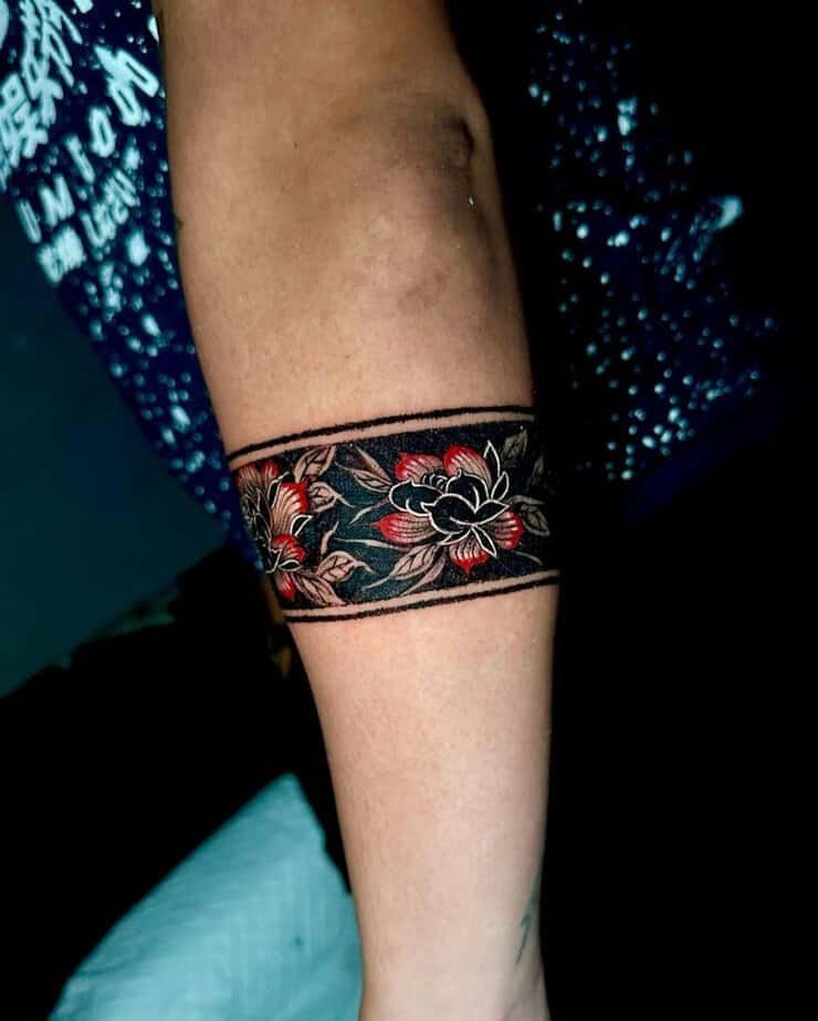 If you want something with a bit more drama, try a darker floral band. The contrast of white and red ink against deep shading makes the flowers pop, and it gives the whole piece a moody, romantic energy that I can’t stop thinking about.