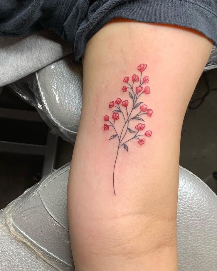 There’s just something about a fine line tattoo in red that feels tender and fierce at the same time. The classic meaning of baby’s breath is pure love, but swap in red tones and it leans into passion and devotion. It’s soft, pretty, and has an intensity beneath the surface — great if you want your ink to whisper feelings, not shout them.