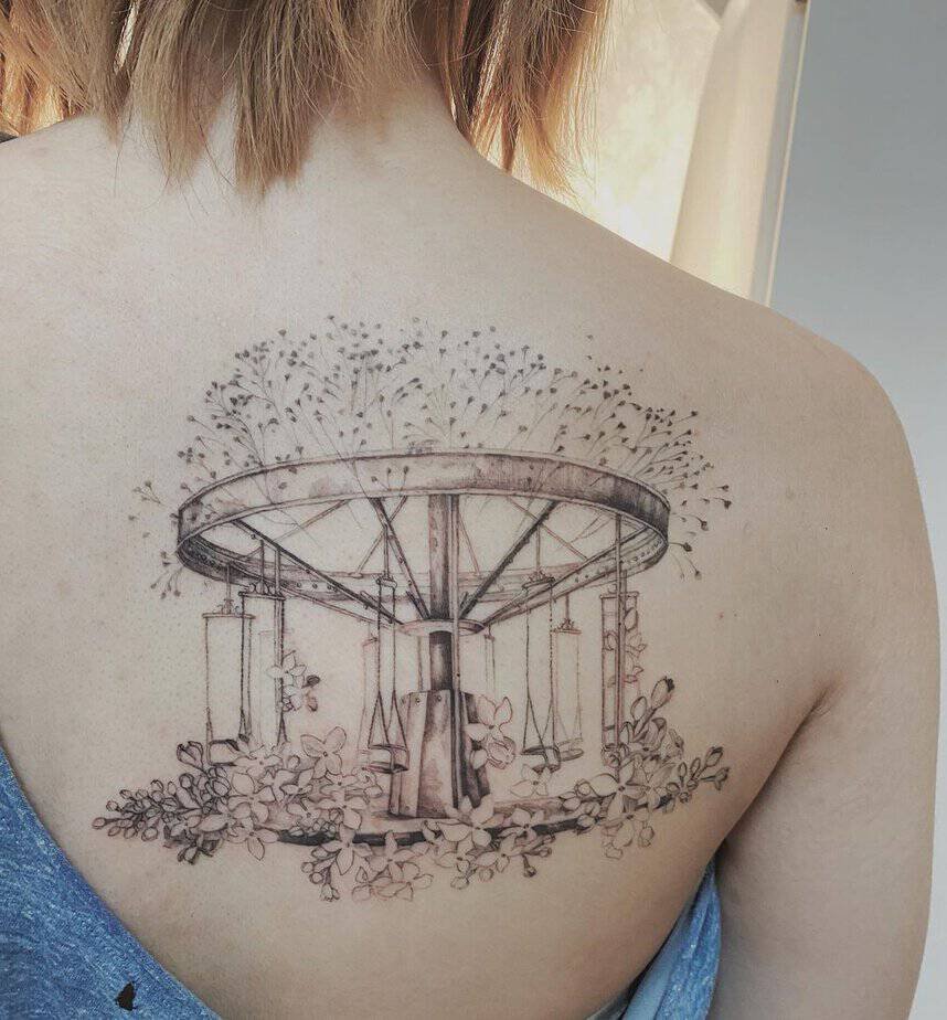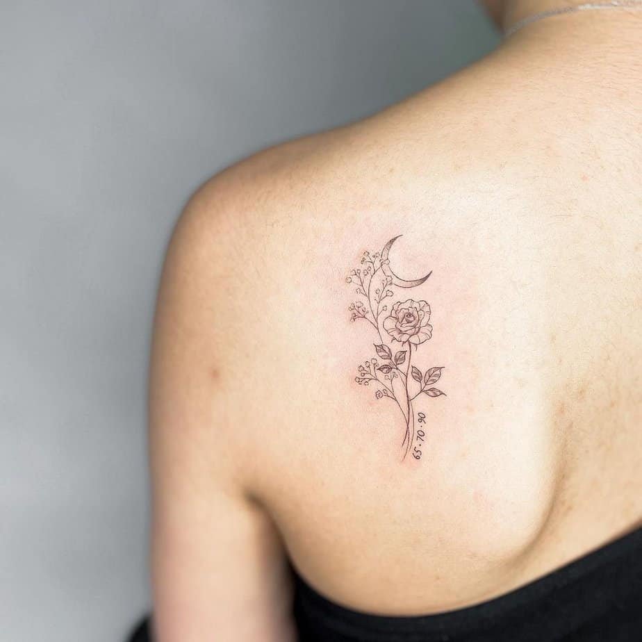 This back piece mixes baby’s breath and rose beneath a moon, and it’s simply enchanting. People have even added family birth years into the design, which makes it a timeless tribute. It reads like a love letter to family — quiet, gorgeous, and full of memory.