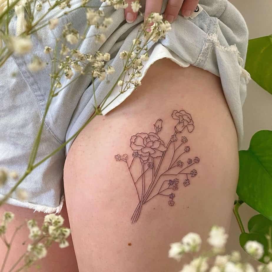 This thigh piece pairs carnations with baby’s breath using fine lines, creating a discreet and elegant look. Together they speak of pure, selfless love — the kind you’d wear as a quiet tribute to someone important in your life. Feminine, refined, and full of feeling.