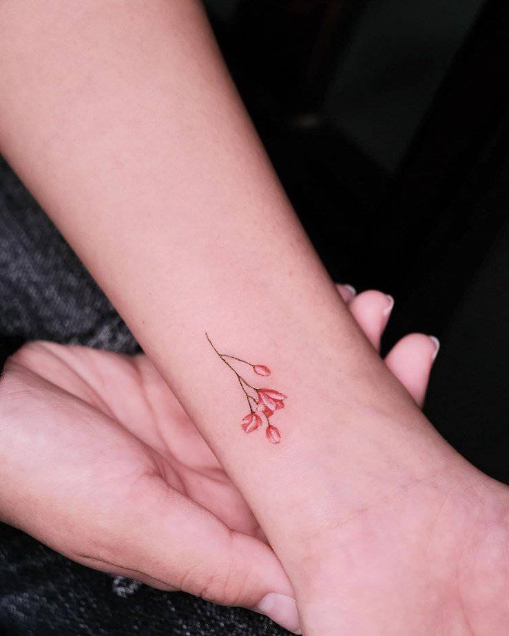 This wrist piece is small but full of character — a baby’s breath vine with pops of red that reads romantic and delicate. It’s a lovely choice if you want something visible but not overpowering, and it’s the sort of tattoo that adds a little daily charm to your look.