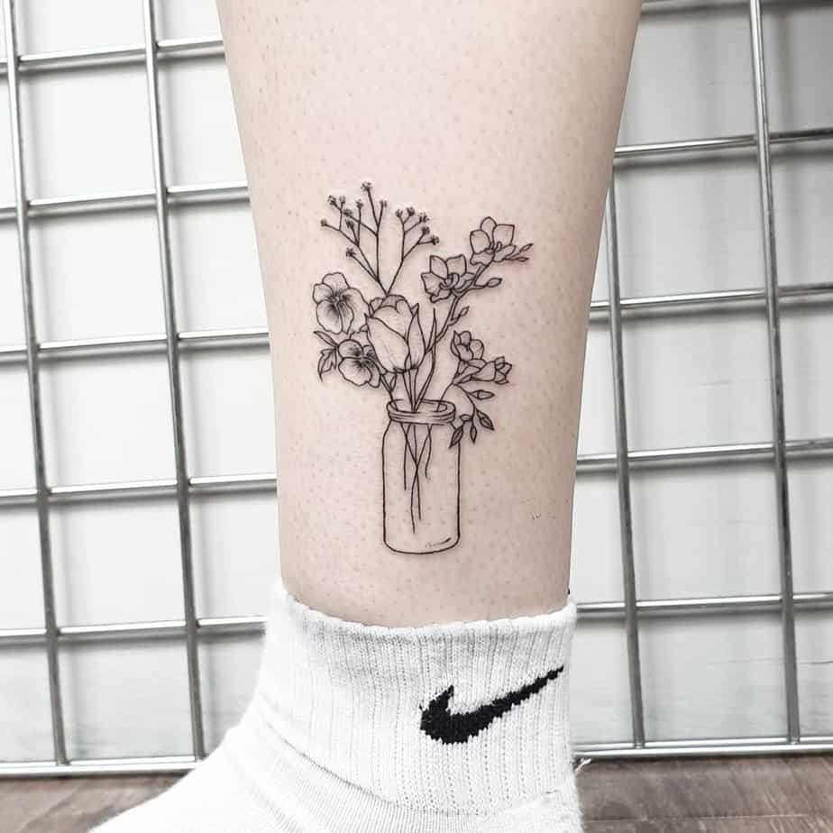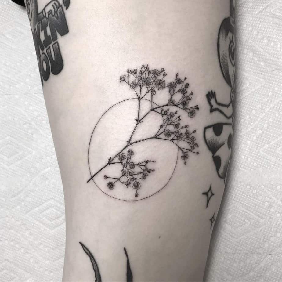 This one mixes delicate baby’s breath branches with clean geometric shapes, which immediately gives the tattoo a modern edge. It’s elegant but has a cool, slightly mysterious vibe. On the leg it reads like art you can wear, and it’s also a lovely reminder to cherish and nurture the relationships that matter to you.