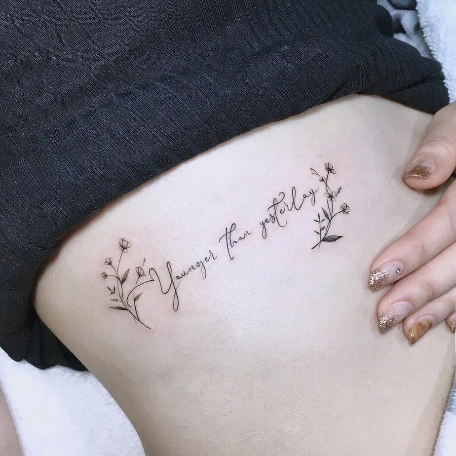 Rib tattoos can be quietly powerful, and pairing baby’s breath with a motivational quote is such a good combo. It’s like wearing your own pep talk — a reminder to embrace life and keep your inner child alive. A tiny boost of inspiration that’s also visually lovely.
