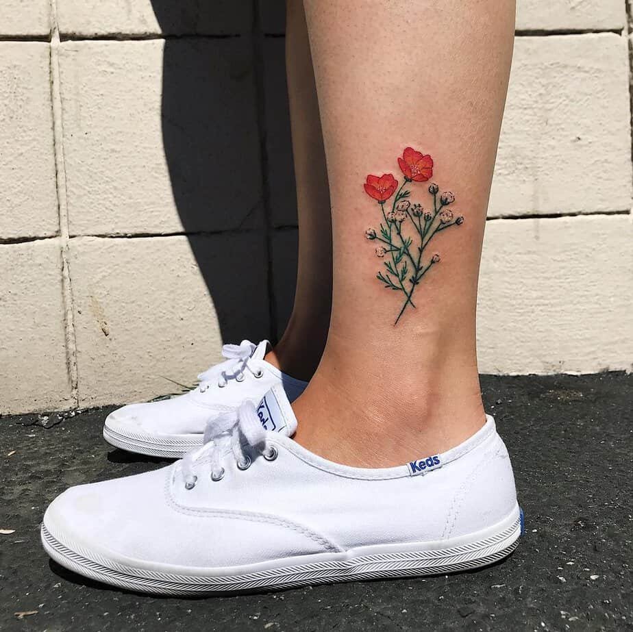 This ankle piece mixes delicate baby’s breath with bold red poppies, and it’s such a compelling contrast. Baby’s breath brings the gentle, enduring love vibe, while poppies touch on remembrance and sacrifice. Together they feel like a little memorial and a celebration all wrapped into one colorful scene.