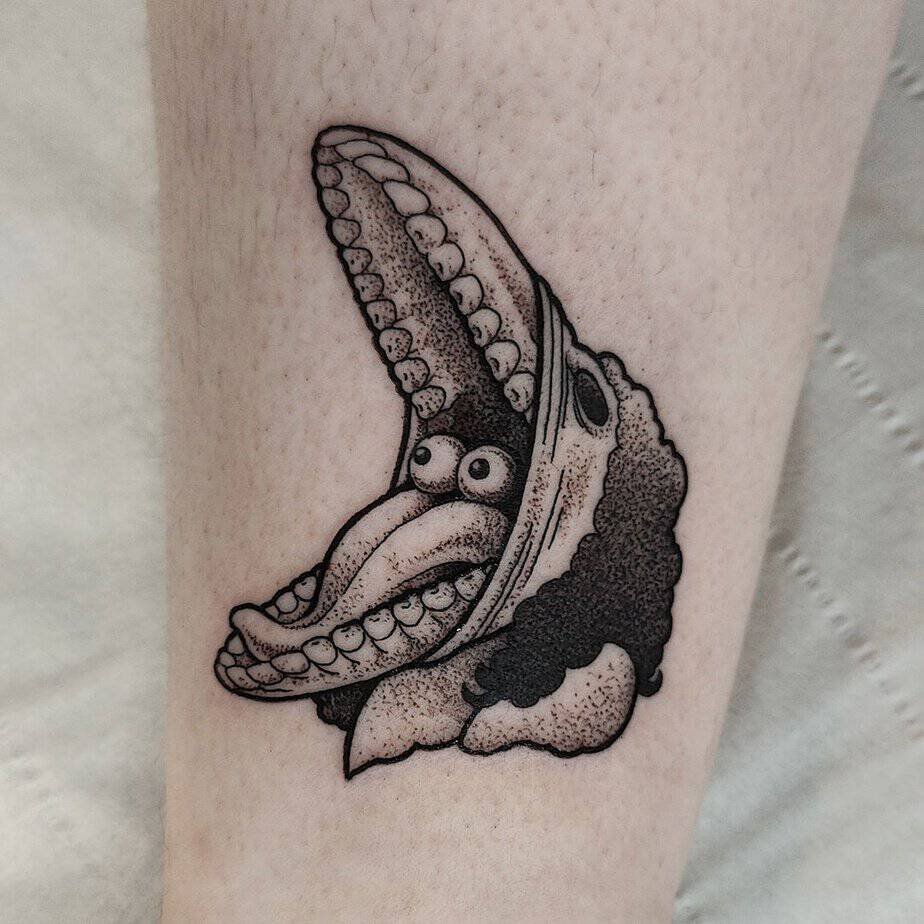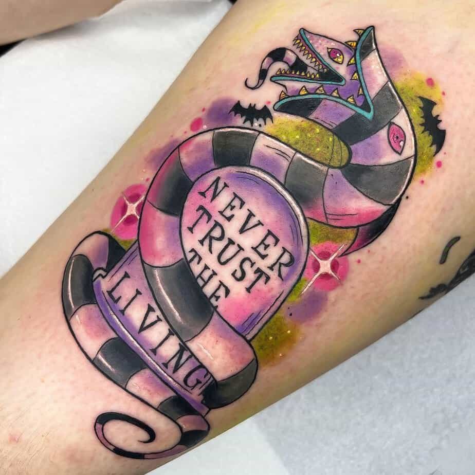 This is basically a highlight reel of the film inked into one piece. Beetlejuice, his wild eyes and green hair, a curling worm, and the infamous Handbook for the Recently Deceased all thrown together in bright, bold colors. It’s busy in the best way — the kind of tattoo where you keep spotting new details every time you look.