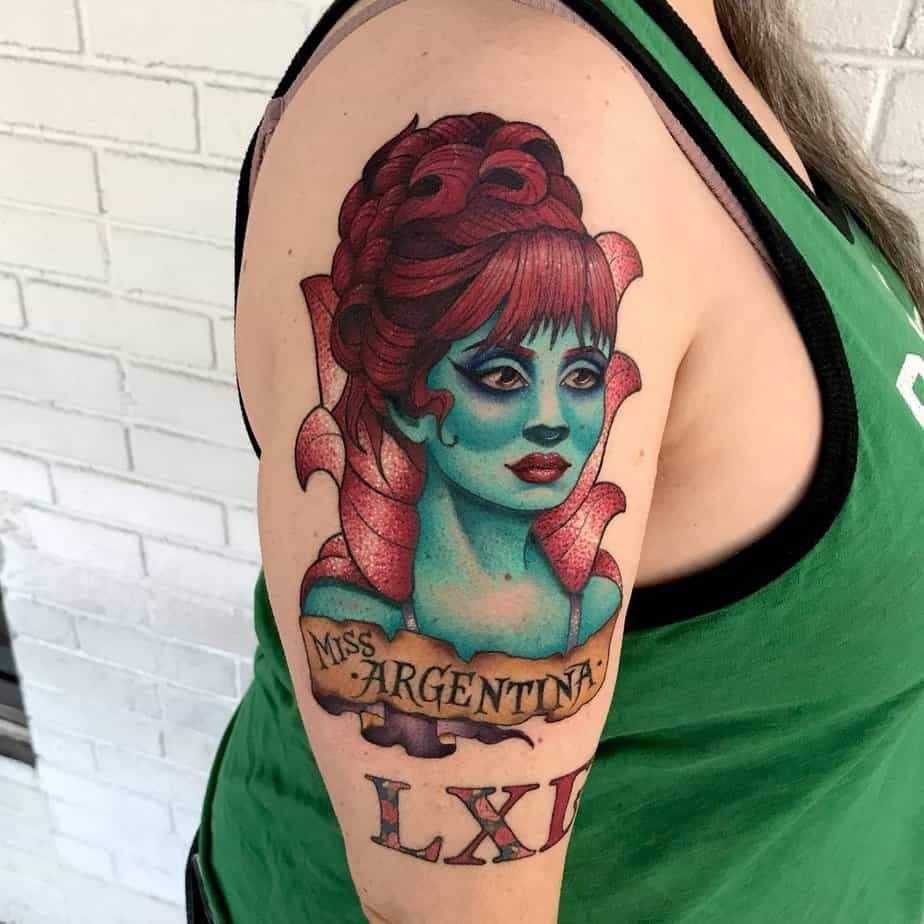 Miss Argentina gets her moment here in a gorgeous, colorful portrait — turquoise skin, red hair, lush eyeshadow. There’s a sadness to her look that the tattoo captures beautifully, and little details like the banner underneath make it feel official, almost like fan-club regalia. If her character stuck with you, this is a stunning tribute.