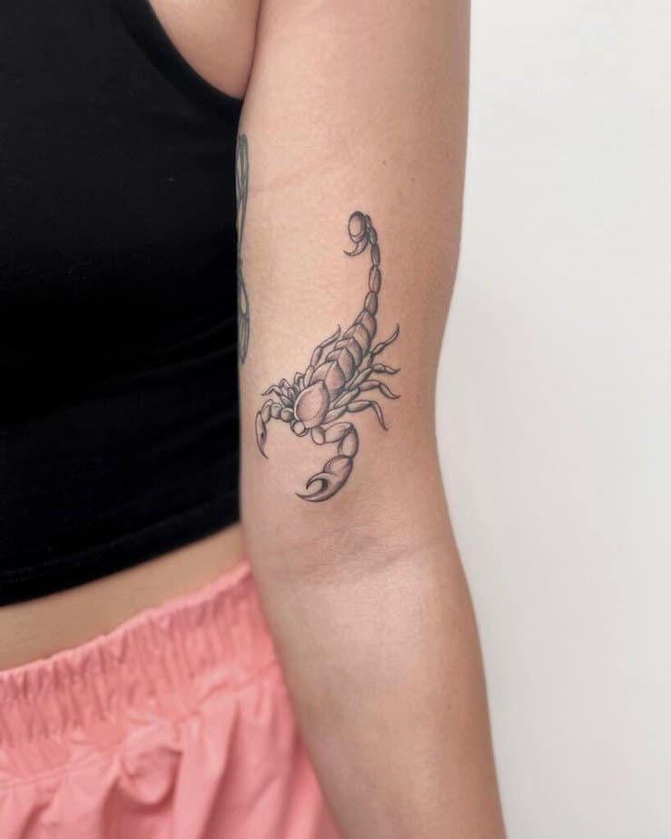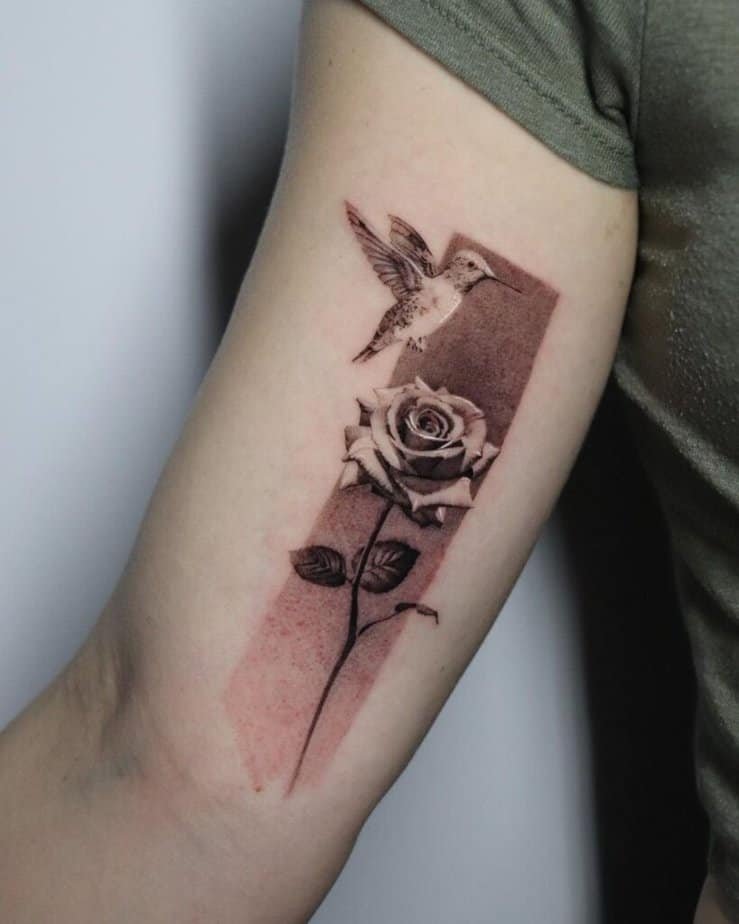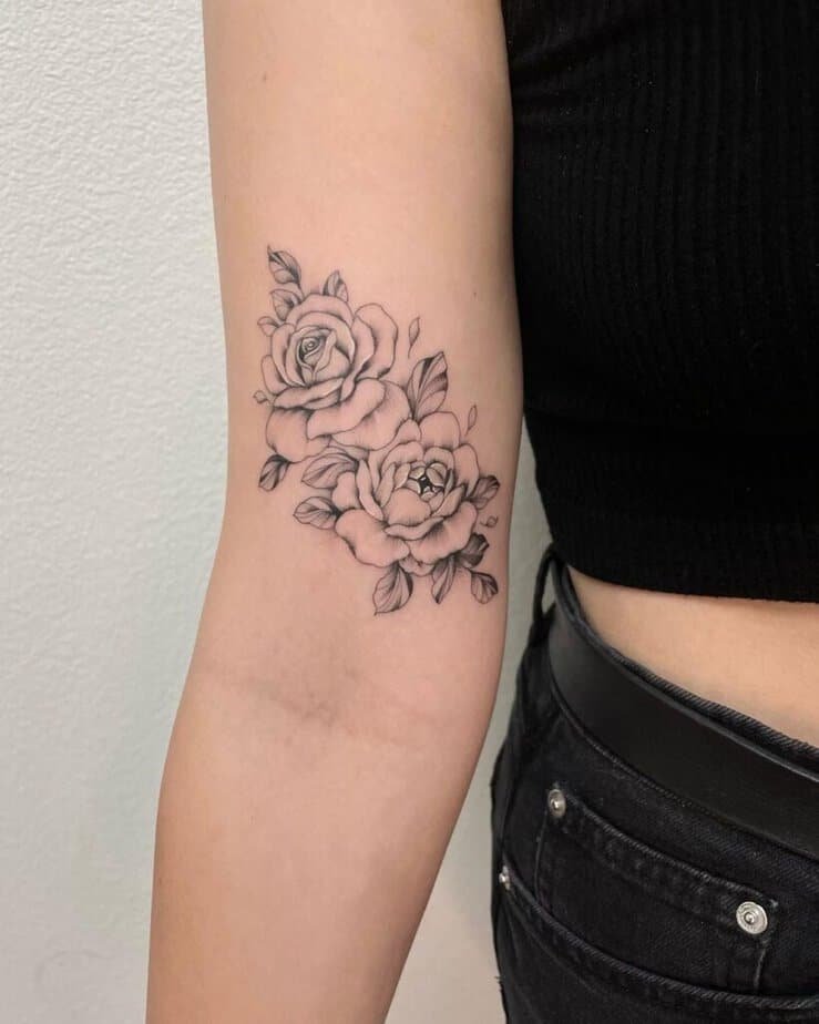 If a tiny rose feels too coy, go a bit bigger. A larger black-and-gray rose looks beautifully timeless on the bicep and you can always add color later if you want to turn up the volume. It’s romantic but still strong.