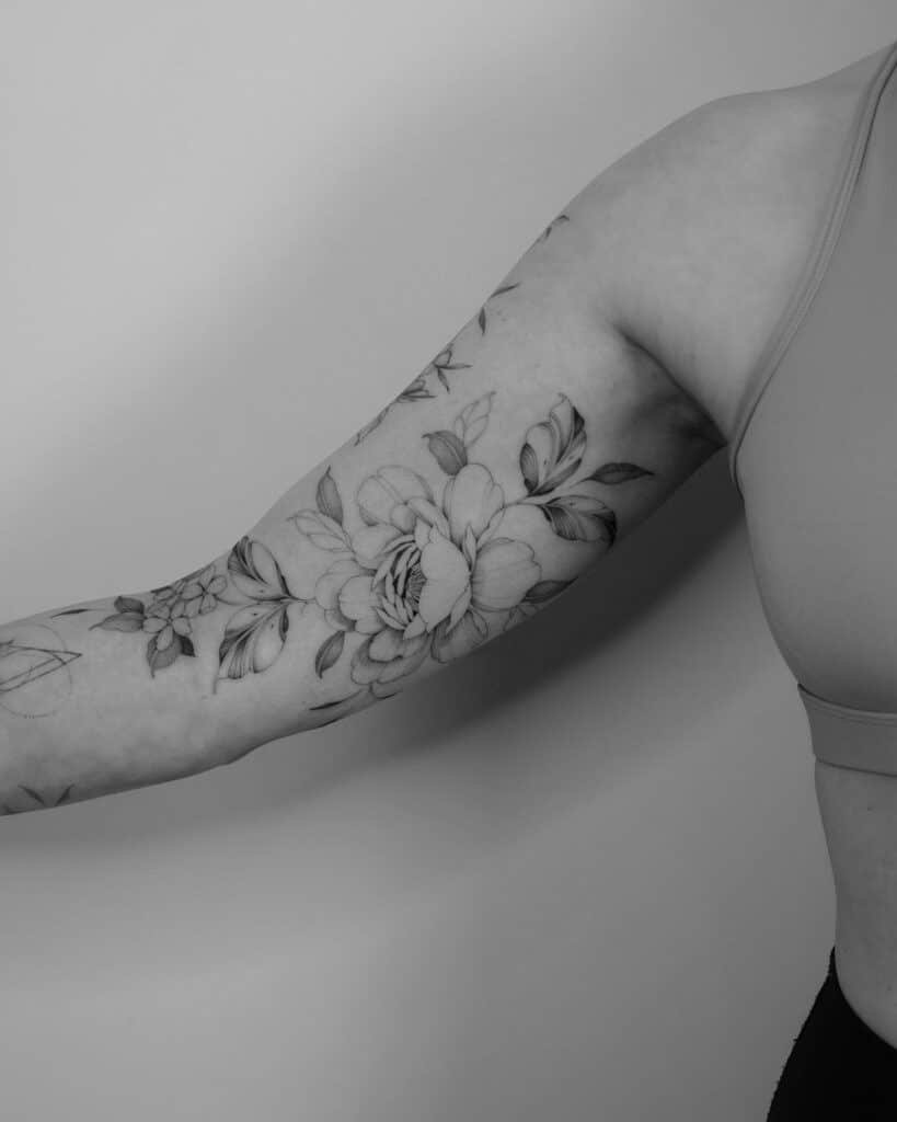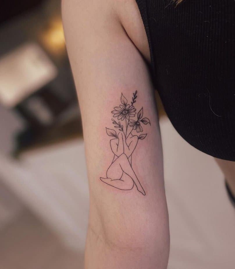 This one blends portraiture and florals in a gentle outline. It’s feminine without feeling twee — just a calm, creative statement that hugs the curve of your bicep.