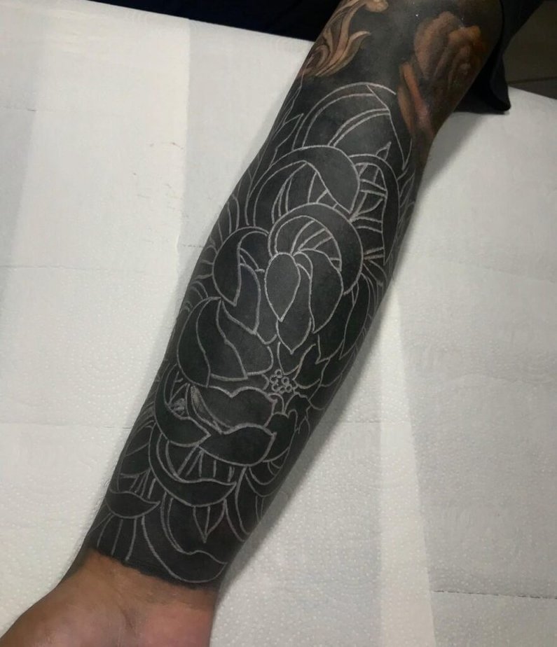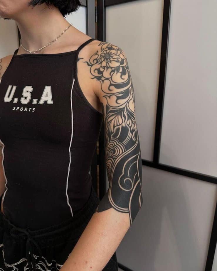 Starting things off with something softer: this version keeps the blackout small and lets skin show through to form flowers and flowing lines. It’s perfect if you want the drama of black ink without losing that delicate, organic feel.