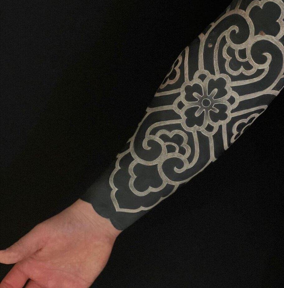Blackout doesn’t always have to be overpowering. Here’s a forearm treatment that keeps things elegant and wearable while still being striking.