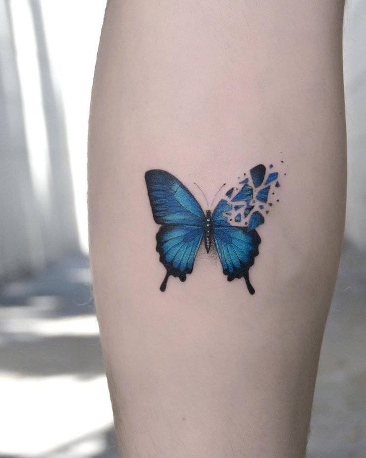 If you're into tattoos that spark curiosity, this calf piece is gorgeous — a blue butterfly whose wing seems to be tearing away into delicate fragments. It reads like a visual reminder of life's transience: one day everything changes, which sounds heavy, but it also nudges you to notice the little wonders and the people around you while you can.