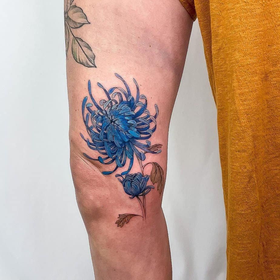 Okay, this one’s for anyone who doesn’t mind a little attention — a blue butterfly perched on the knee, done with dotwork for extra charm. It’s playful and kind of dramatic in the best way, and the symbolism is sweet: butterflies mean transformation, so it’s like wearing your own little declaration that you can change and grow.