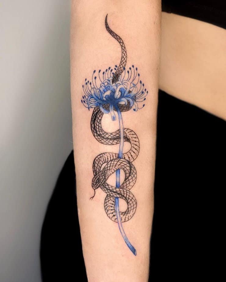 A snake curled around a blue spider lily mixes a little danger with hope. Snakes symbolize shedding the old, and spider lilies hint at rebirth — together they read as transformation, the kind that nudges you toward growth and new chapters.