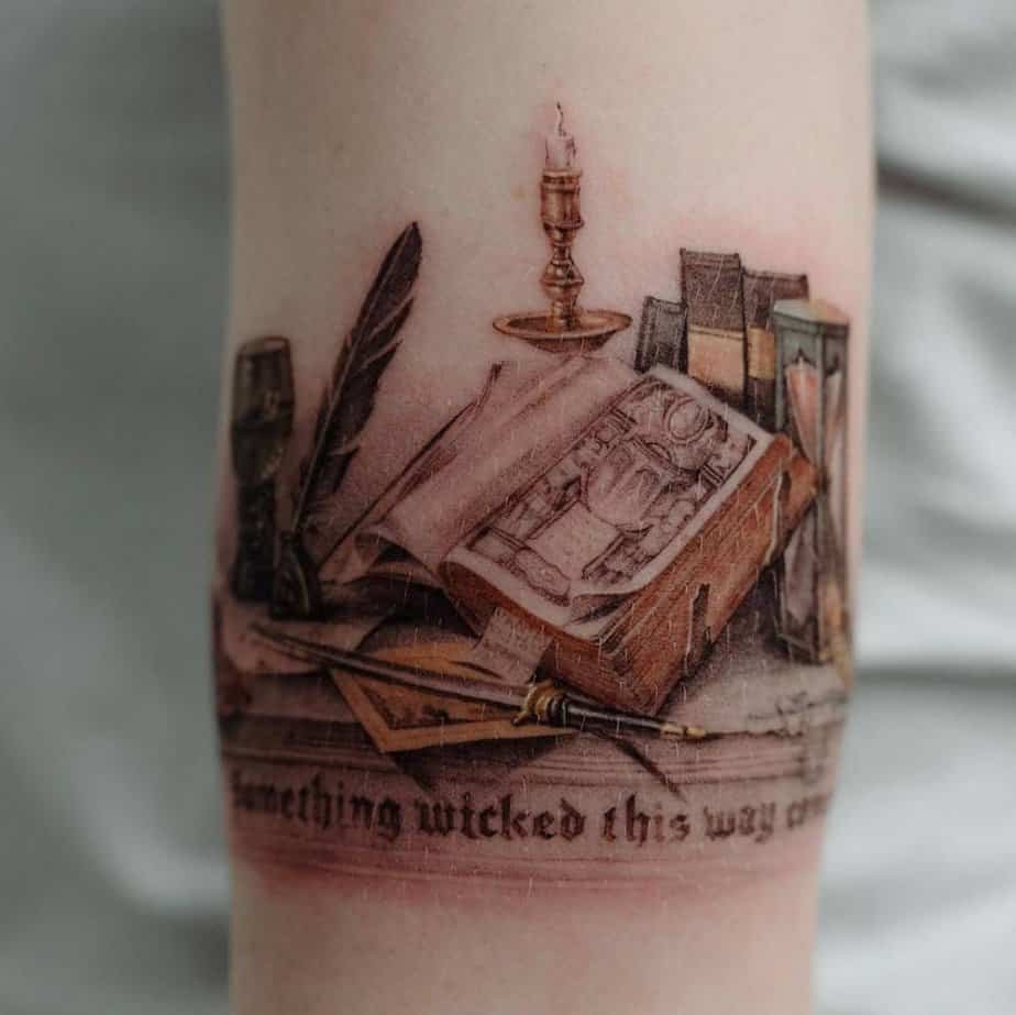 This one vibes gothic library: a quill, a candle, and an open book with the line “Something wicked this way comes.” It’s richly detailed and mysterious, perfect if you want your tattoo to whisper classic-cool and a touch of the dramatic.