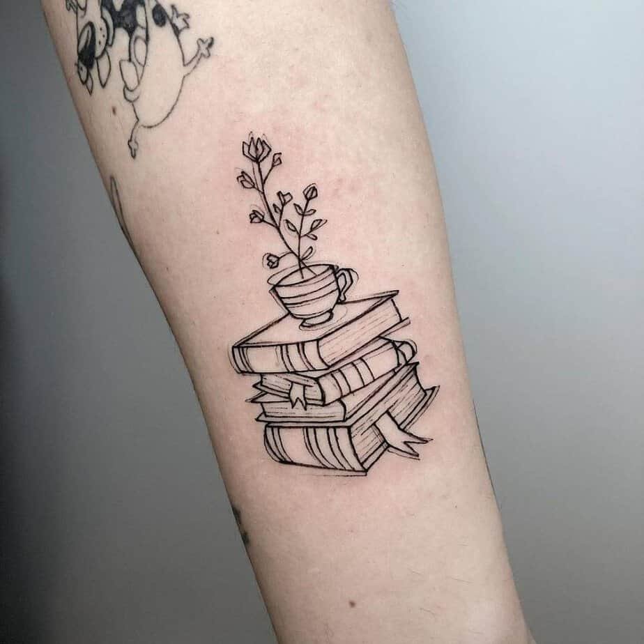 This design literally radiates warmth: a stack of books topped with a teacup and a little flower poking out. It’s the tattoo version of curling up in your favorite nook with tea and a good story. The flower adds that soft symbolism of growth and calm, like reading that heals you a little each time.