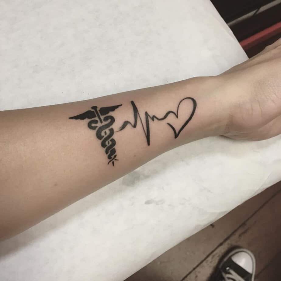 Let’s start with arms because they’re so easy to show off (or hide with a sleeve depending on your vibe). Some of these take the classic staff and dress it up — think moons, suns, leafy branches — which feels boho without trying too hard. Then there are smaller, classic takes that’ll snugly fit anywhere on your arm; those are great if you want something subtle that still reads as meaningful. One piece even tucks a heart sketch at the top and uses dotwork to give the whole thing personality. A practical note: folks with chronic conditions like diabetes sometimes choose a Caduceus as a medical alert of sorts, which can be life-saving. If you want something softer, flowers pair beautifully — pick your favorites, decide how much color you want, and call it yours. For lovers of minimalism, there are versions with tiny ornaments and geometric shapes that keep things clean. And I’m obsessed with the design that morphs into a heartbeat; it’s such a sweet, literal nod to care and the medical world.