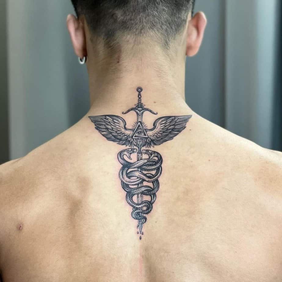 Your back is a dream because there’s so much canvas — you can make it tiny and tucked or go full-on statement. If geometric tattoos are your thing, there are designs that layer shapes behind the staff for extra depth. Fans of black-and-gray will love the detailed shading and moody contrast on some of these; they age nicely and read very classic. There are also medium-sized traditional Caduceus pieces if you want something that's noticeable without dominating your back. For a bolder, artsier take, try a small Caduceus center surrounded by abstract patterns — it makes the symbol pop while keeping the composition interesting.