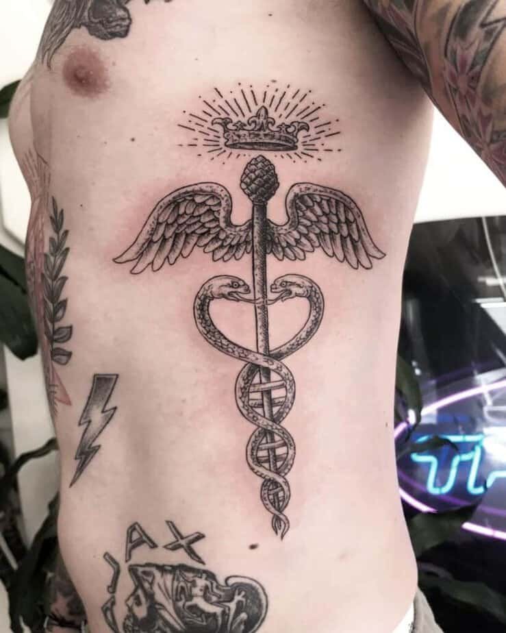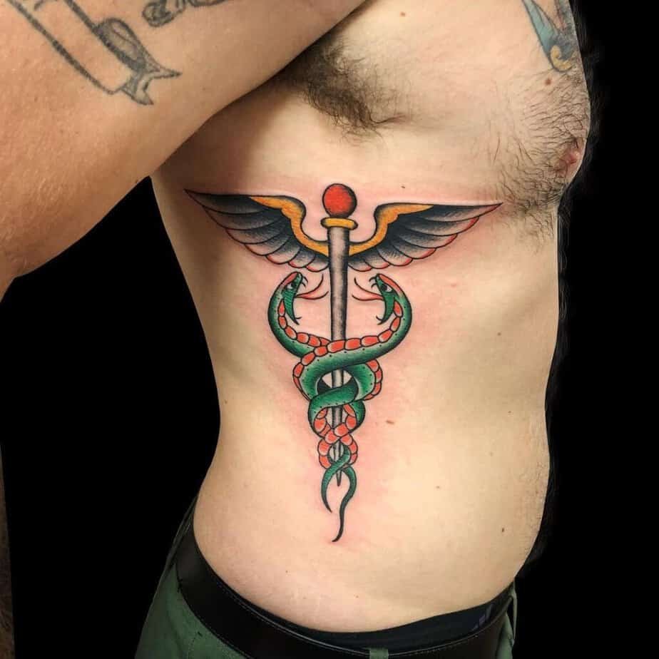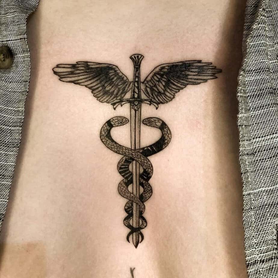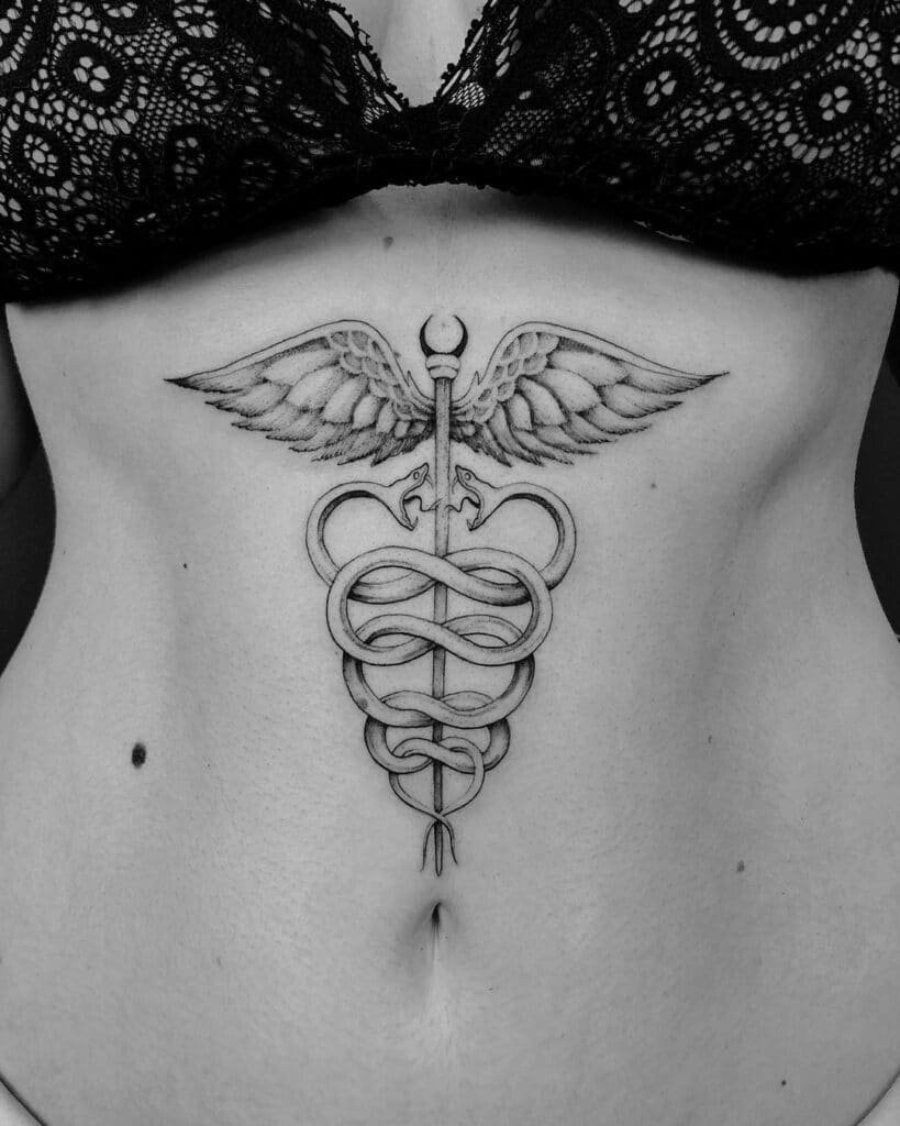 The stomach is such a soft, intimate spot, and a Caduceus there reads elegant and intentional. Because it’s a more delicate area, even a modest design can look really refined — like wearing something meaningful beneath your clothes that only you (and those you choose) see.