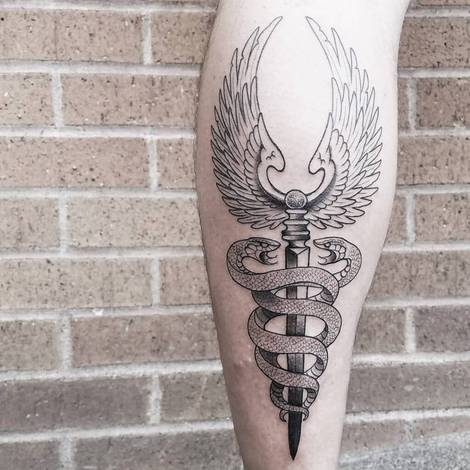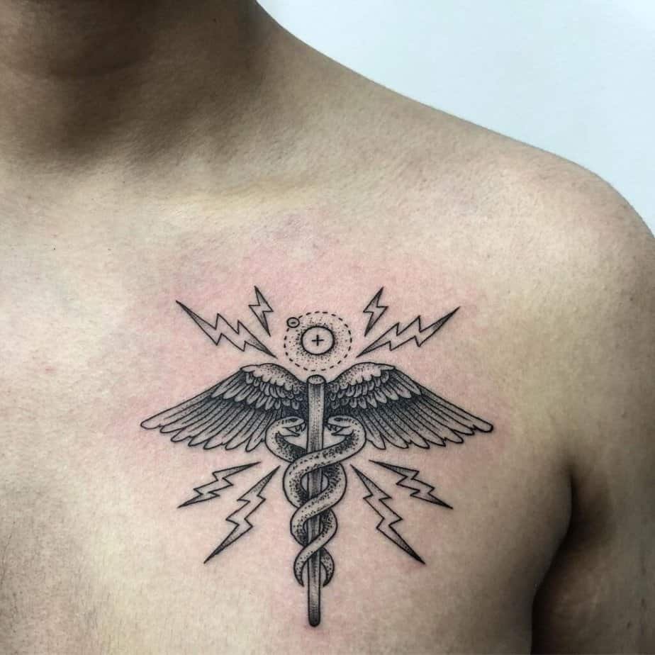 Chest tattoos can be gloriously dramatic or quietly symmetrical depending on what you want. If you’re going big, there are pieces where the staff is framed by huge wings that spread across the chest — very cinematic and definitely a commitment, but stunning. If you prefer simple balance, a centered Caduceus works so well; it reads clean and precise. For something that packs more punch, choose a bolder black-ink version that emphasizes contrast and presence. And if you like asymmetry, one-sided chest placements are an elegant option — some folks even add lightning bolts or other small details to personalize it.