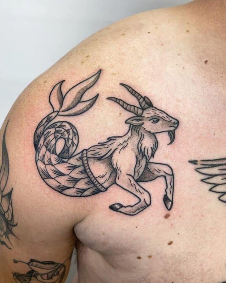 Shoulders are great when you have a design you want to show off a bit. There’s plenty of space, so you can go intricate or keep it airy. A full sea-goat here reads bold and intentional — which, honestly, is peak Capricorn.