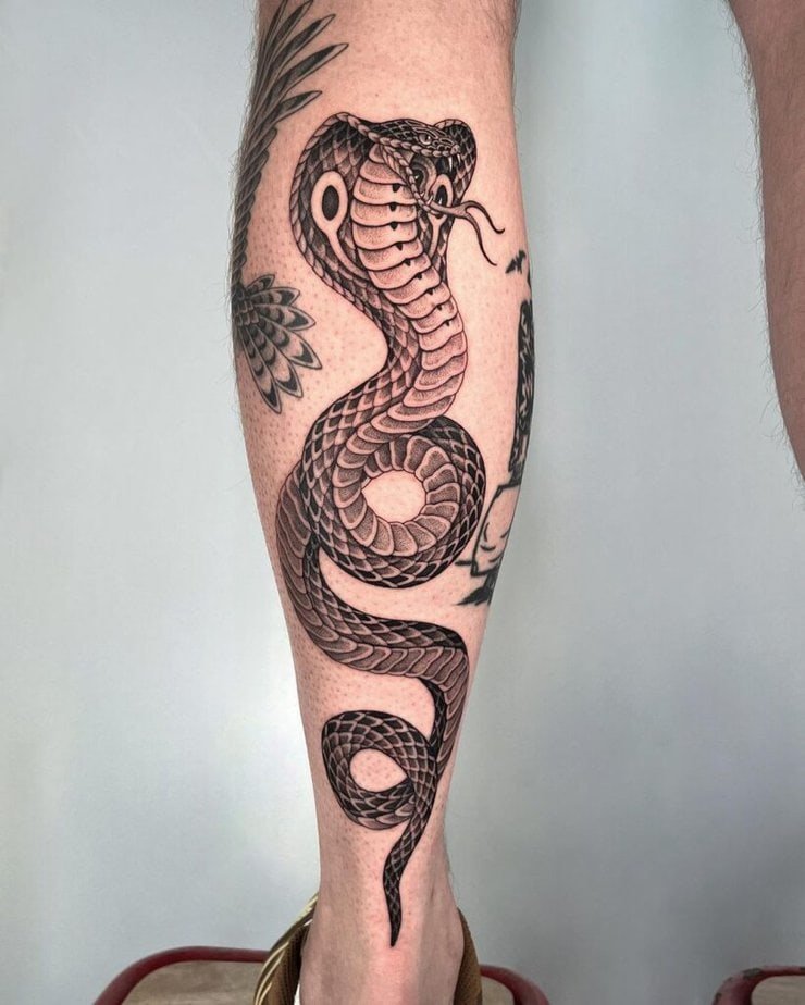 Legs are the ideal canvas for length and motion. A cobra that stretches along your leg can feel elegant, fierce, and a little seductive — basically snake-charming energy.