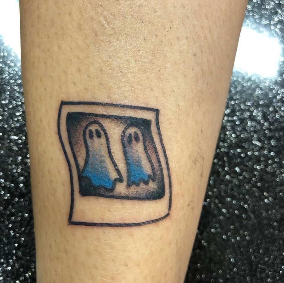 This small forearm piece uses a frame to turn two tiny ghosts into a miniature art print. The dark background gives it a touch of gothic elegance, but the ghosts themselves keep it light and playful. Clean, simple, and oddly cozy.