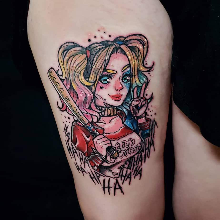 Harley brings color, attitude, and a cheeky sense of danger. This upper arm piece captures her classic look and that “don’t mess with me” energy. If you want to feel a little more chaotic in your day-to-day, this is the kind of tattoo that helps.