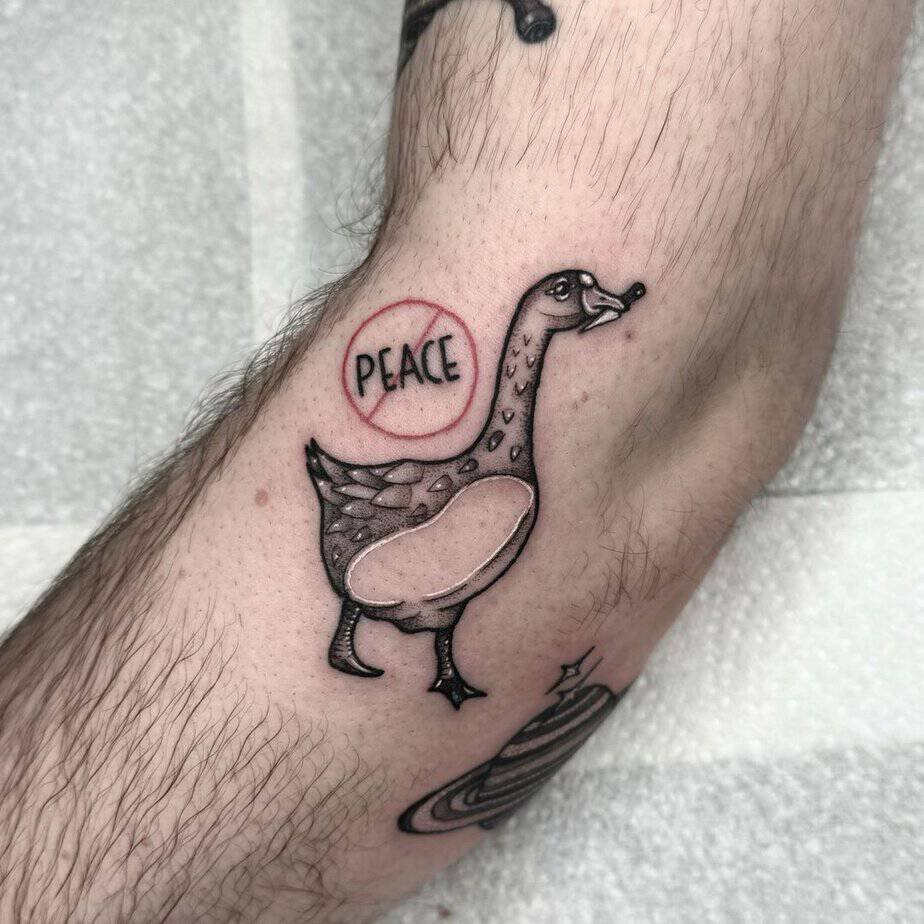 Okay, imagine a goose on the loose with a knife in its beak and a sign that basically promises you no peace — I mean, who wouldn’t smile at that? This black-and-gray piece flips the gentle-goose stereotype into something gleefully chaotic. It’s perfect if you like the contrast between cute and just-a-bit-threatening.