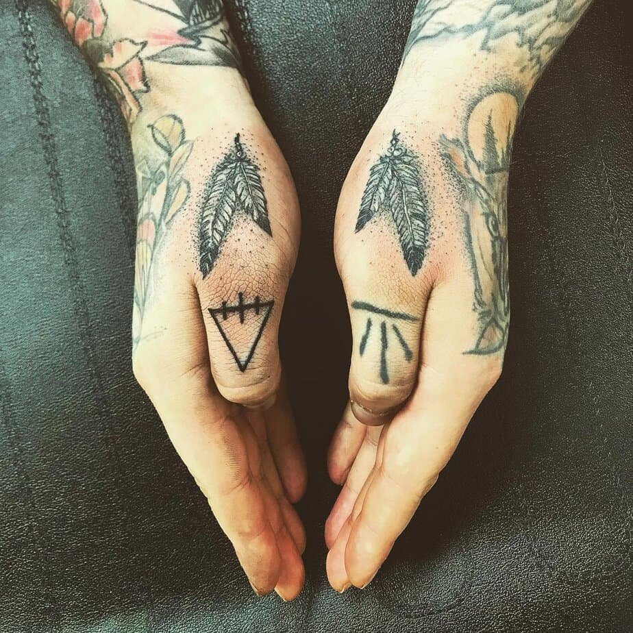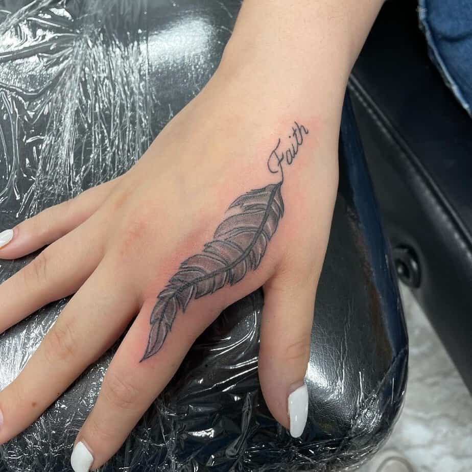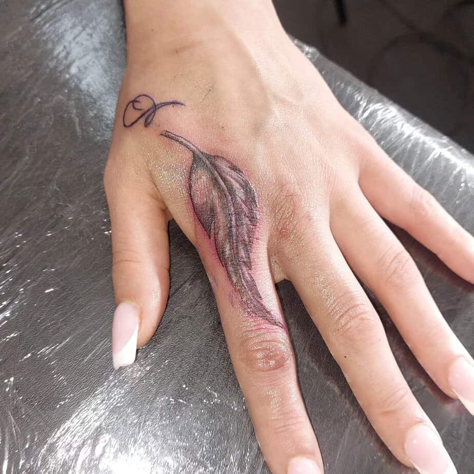 If perfection and symmetry call your name, matching feathers on both hands are gorgeous. It’s neat, calming to look at, and gives off a very put-together energy. Just ask yourself if you’re ready to ink both thumbs — that’s the real commitment here.