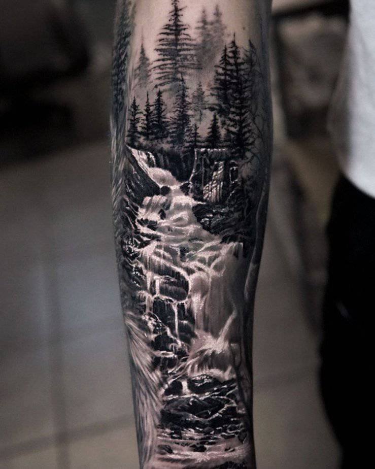 Imagine standing in a forest, the only thing you can hear is water rushing over rocks — now imagine that whole moment wrapped around your forearm. This one’s dramatic in the best way: it’s bold, it moves, and it’s like wearable motion. If you want a tattoo that practically tells a story every time you flex, this waterfall is it.