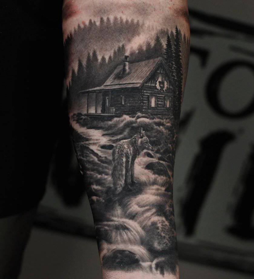 Cozy cabin tucked into trees with a curious fox peeking out? Sign me up. This tattoo feels like an escape: quiet mornings, hot tea, maybe a book. It’s a little storybook and a little comfort blanket — perfect for folks who crave retreat.
