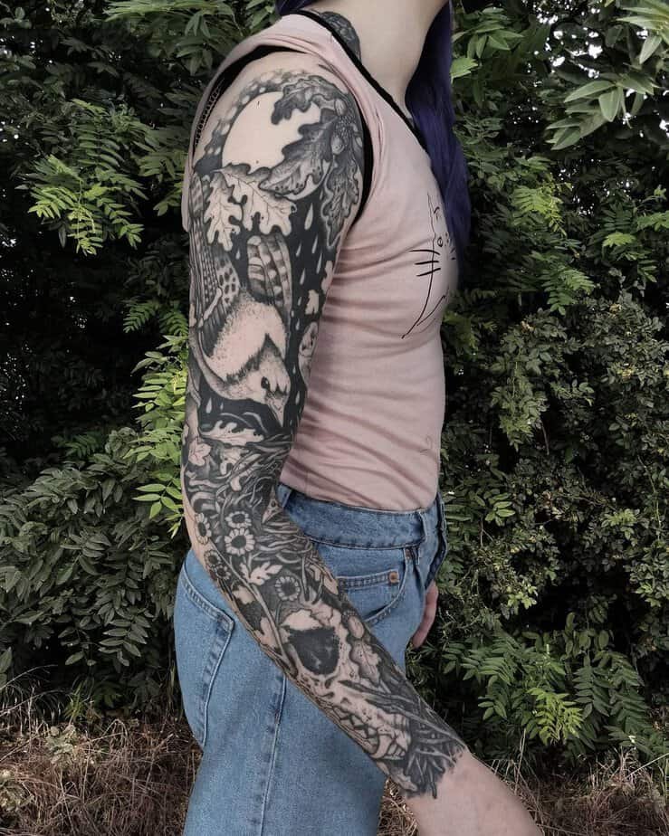Think of this as a full-sleeve hug from the forest: birds, leaves, hidden creatures, all wrapping around your arm. It’s like wearing an entire ecosystem and its stories — great if you want variety and depth in one continuous piece.