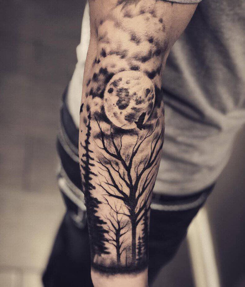 There’s something eerie and gorgeous about moonlight through leafless trees — kind of like a midnight poem. This tattoo gives that chill, enchanting feel: you roll up your sleeve and there’s that whole midnight-hike vibe waiting. It’s moody in the best way.