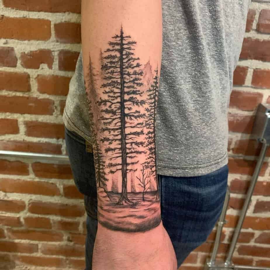 There’s something so grounding about a grove of tall pines inked into a sleeve. These feel like the hug of the forest — steady, towering, and endlessly majestic. Whether you’re a hiker, a nature nerd, or just someone who needs a reminder of big, quiet spaces, this design carries that calm with you.