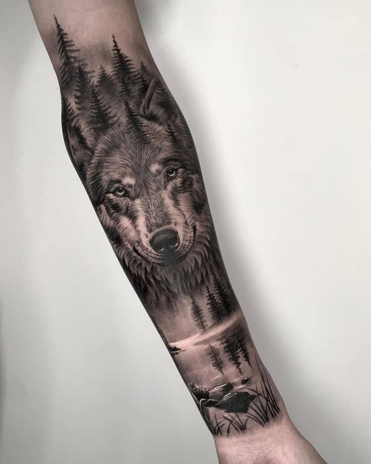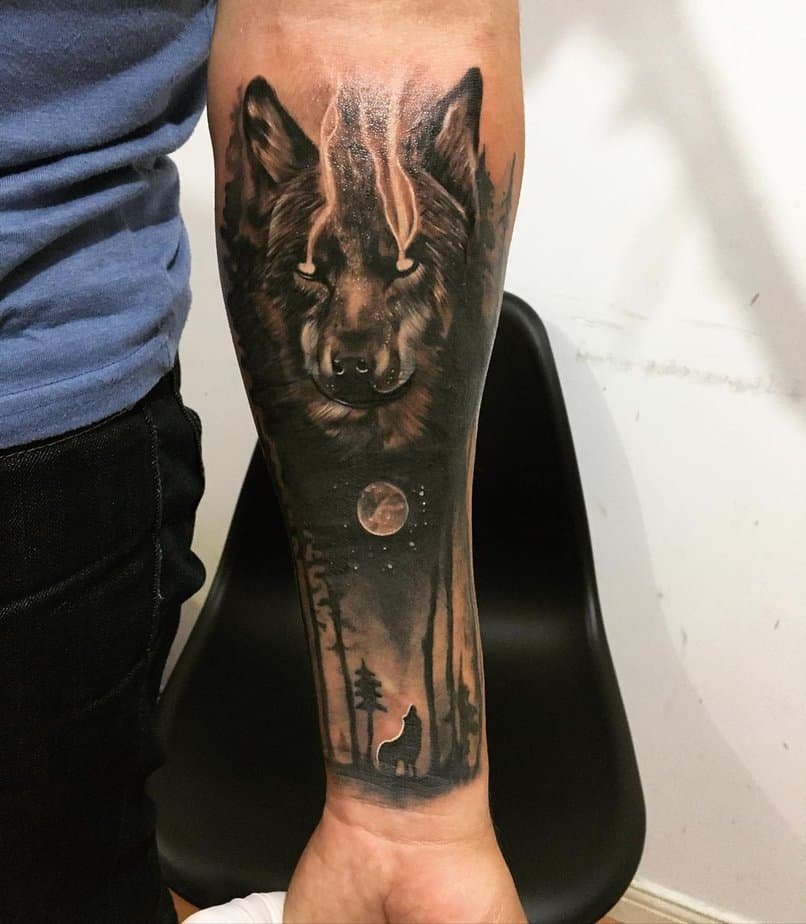 This piece captures solitude and raw feeling: a lone wolf, pines reaching high, and that classic howling energy. It’s bold, a little theatrical, and ideal if you want your tattoo to speak up for you when you don’t feel like talking.
