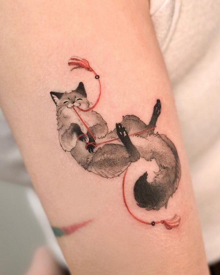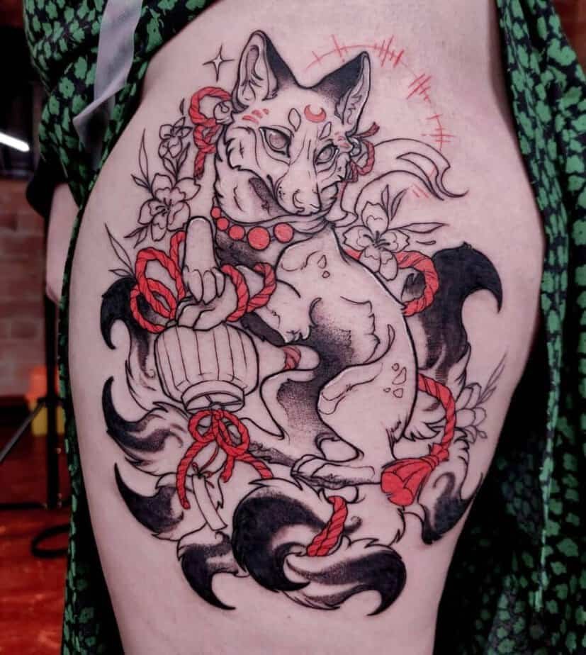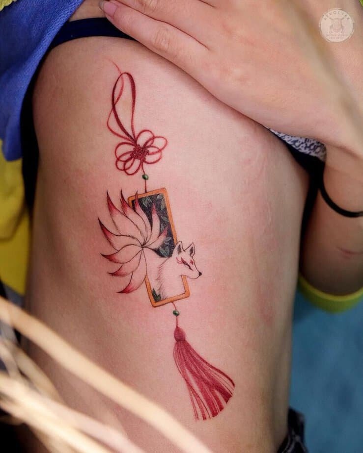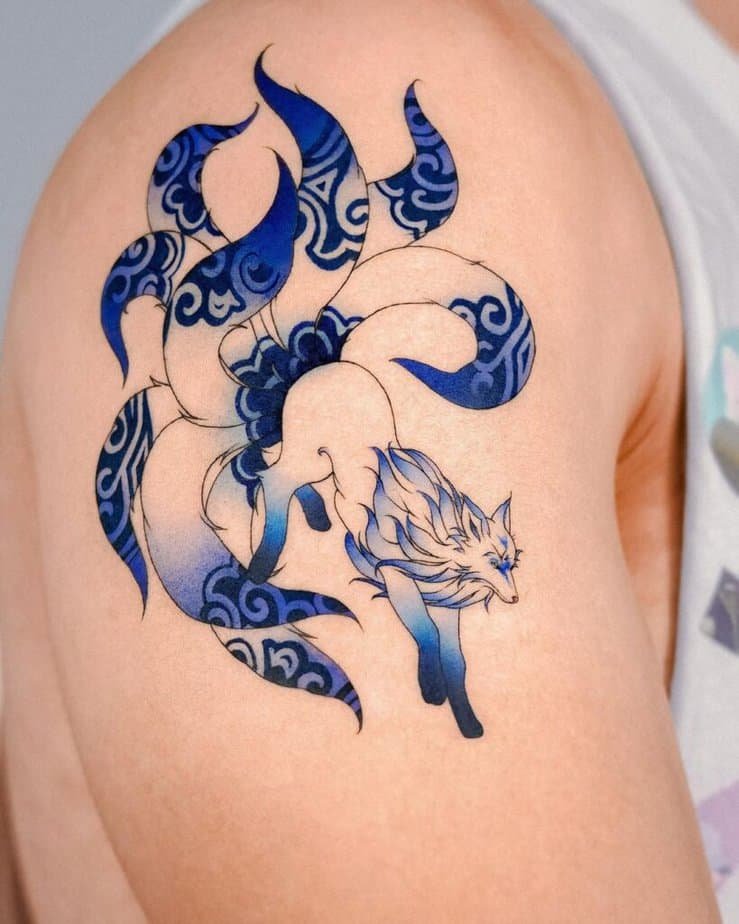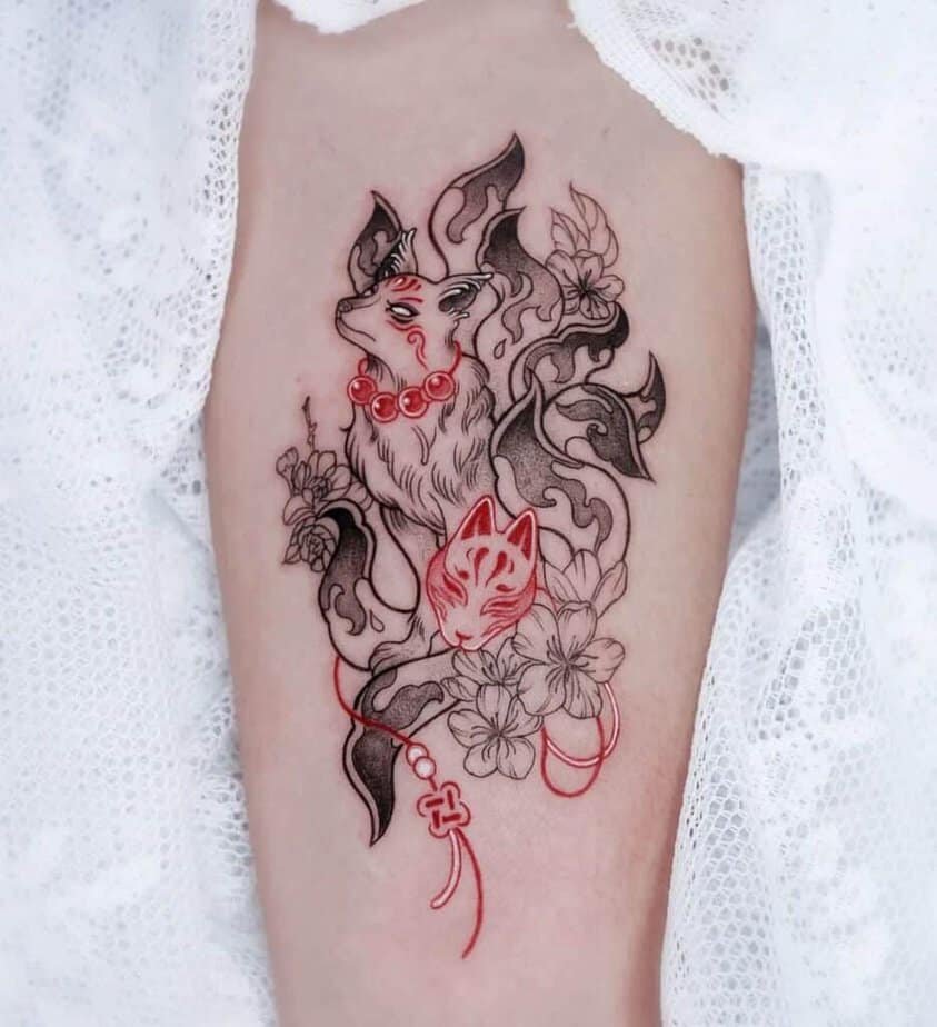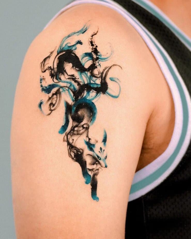 The nine-tailed fox — talk about mythology. In East Asian folklore it’s clever, sometimes deceptive, sometimes spiritual; it can even disguise itself. That makes it such a compelling tattoo: it’s storytelling on your skin. Styles here range from delicate blue washes with fine outlines to small charm-like designs that look like talismans. Some pieces add red accents and white-ink eyes for an otherworldly glow, others go full brush-stroke style so the tattoo reads like ink on paper rather than skin. You’ll see tails with dark tips, wispy floating shapes, moons above the figure, and tiny strings connecting symbols — all of it looks like a scene from a dream. There’s even a feminine design that sits along the abdomen like an ornate charm, and a playful combo of a fox with a little kitty and red flowers that feels completely unique. The lesson? You can make the nine-tailed fox whatever story you want it to tell.