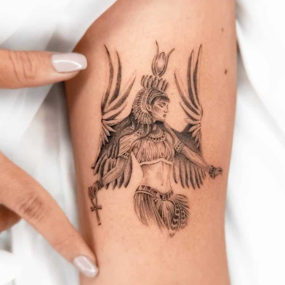 This one feels cinematic: a fierce female warrior with wings spread wide and an ankh in hand, like she could lift off any second. It's the kind of tattoo that says strength and grace at the same time. If you’re into goddess energy or want a protective symbol that reads mythical (but not try-hard), this is it.