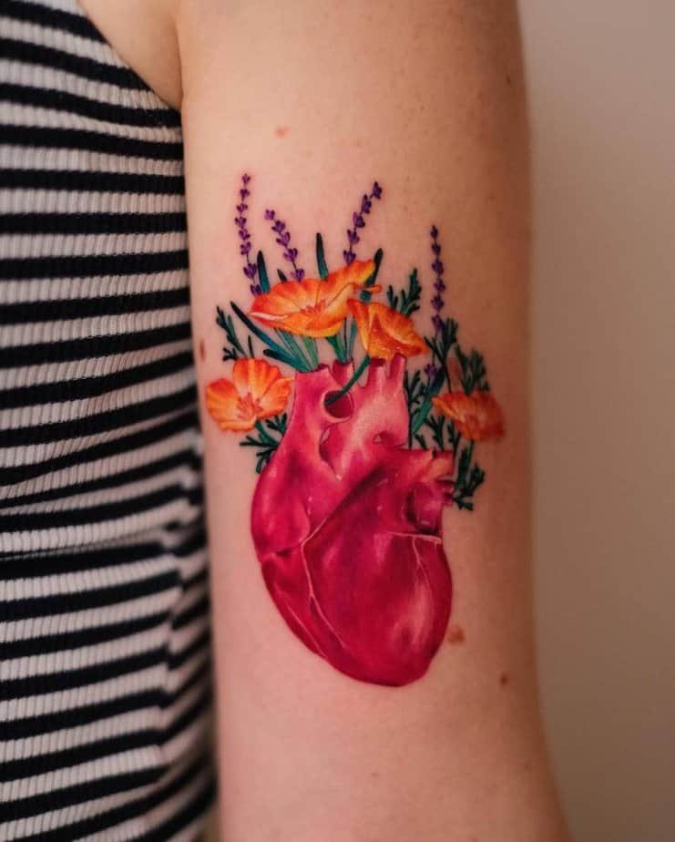Wear your heart literally on your sleeve: a realistic heart bursting into blooms. It’s tender and bold at once — great for anyone who loves emotional transparency mixed with floral beauty.