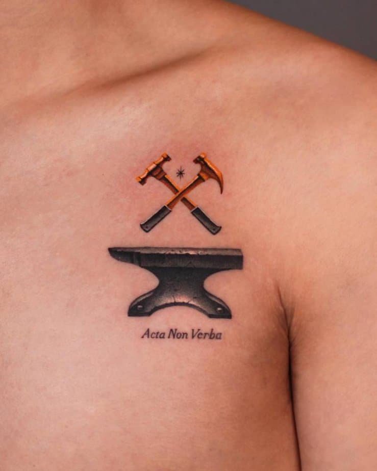 Acta Non Verba — actions, not words. Crossed hammers over an anvil shout craftsmanship, grit, and doing the work. If you value making over talking, this tattoo is a quiet badge of honor.