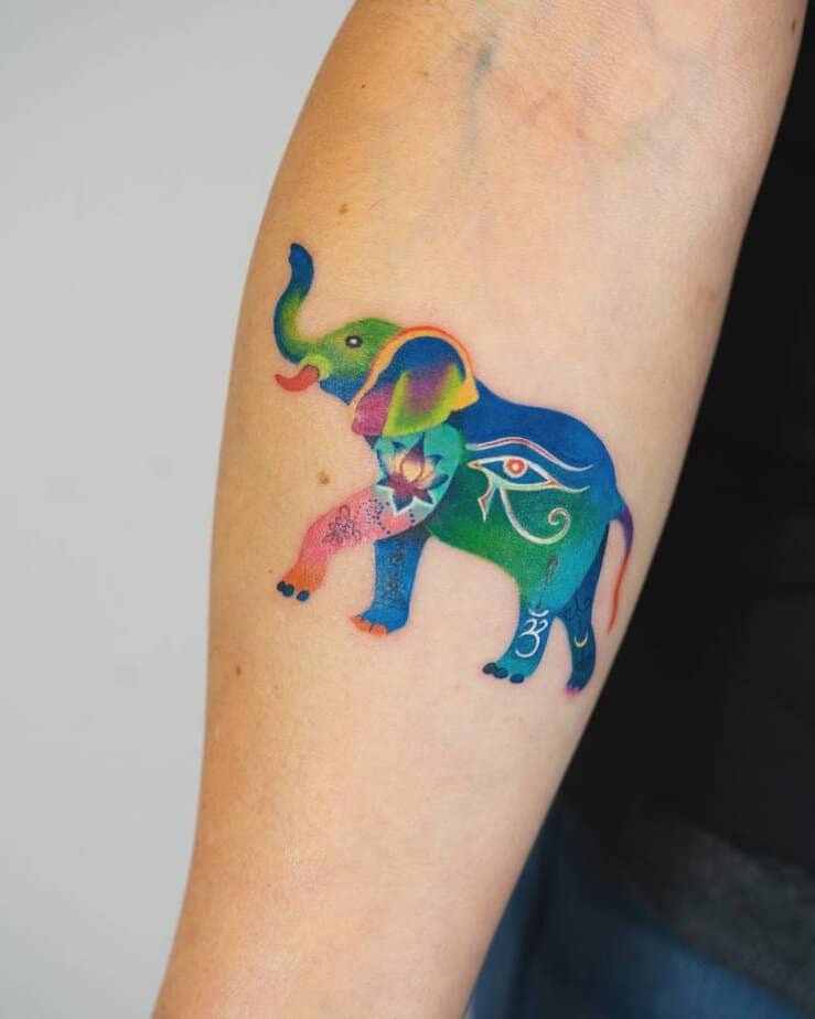 This vibrant elephant is basically a celebration strapped to your skin. It’s wise and lucky by tradition, but honestly it’s also wild with color — your arm turns into a moving piece of art. Whether you’re into elephants for the symbolism or you just crave color in your life, this one’s pure joy.